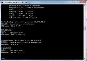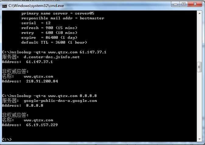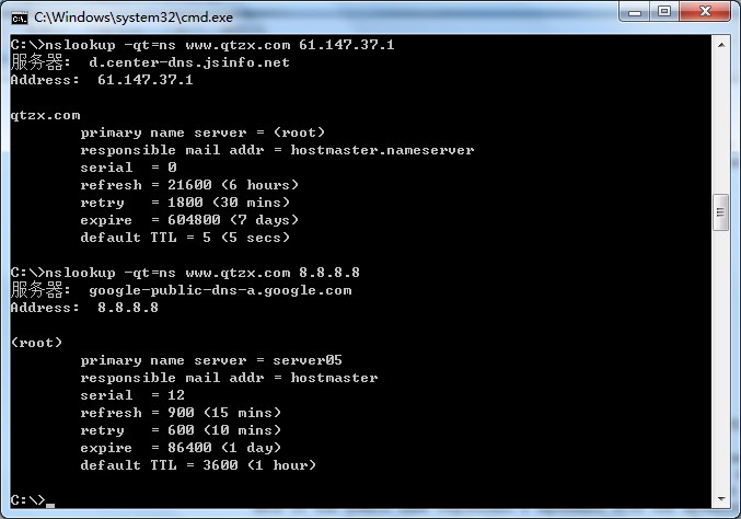 我用nslookup命令分别查询了下qtzx.com的NS记录和www.qtzx.com的A记录,结果如下: