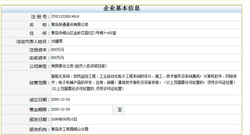 1、青岛快通通讯有限公司,在青岛工商局网站查询到的信息如下: