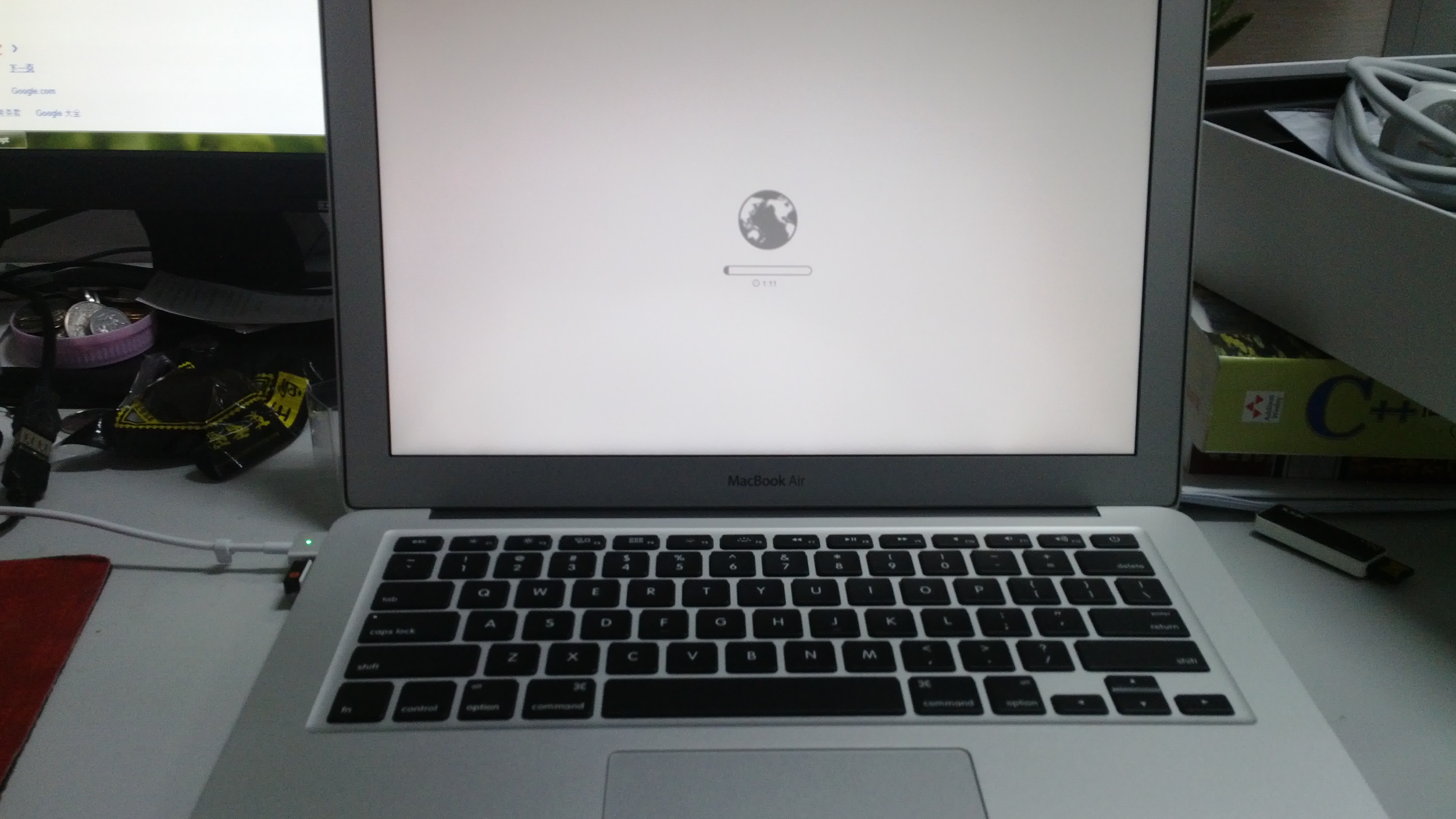 赶紧google,网上说,可以在开机的时候,按option键,出来启动项选择的时候,按command+r,可以进行互联网恢复,赶紧试试。air看来真是个玩具啊,没有光驱我忍了,有线网卡也没有。好吧,还有这边有无线网络,连上,那个地球滚了几圈,出来一个感叹号,“appple.com/support 4403f”,悲催的我啊!一连试了10次,还是这个错误,不甘,跑去楼下,一样……我囧……