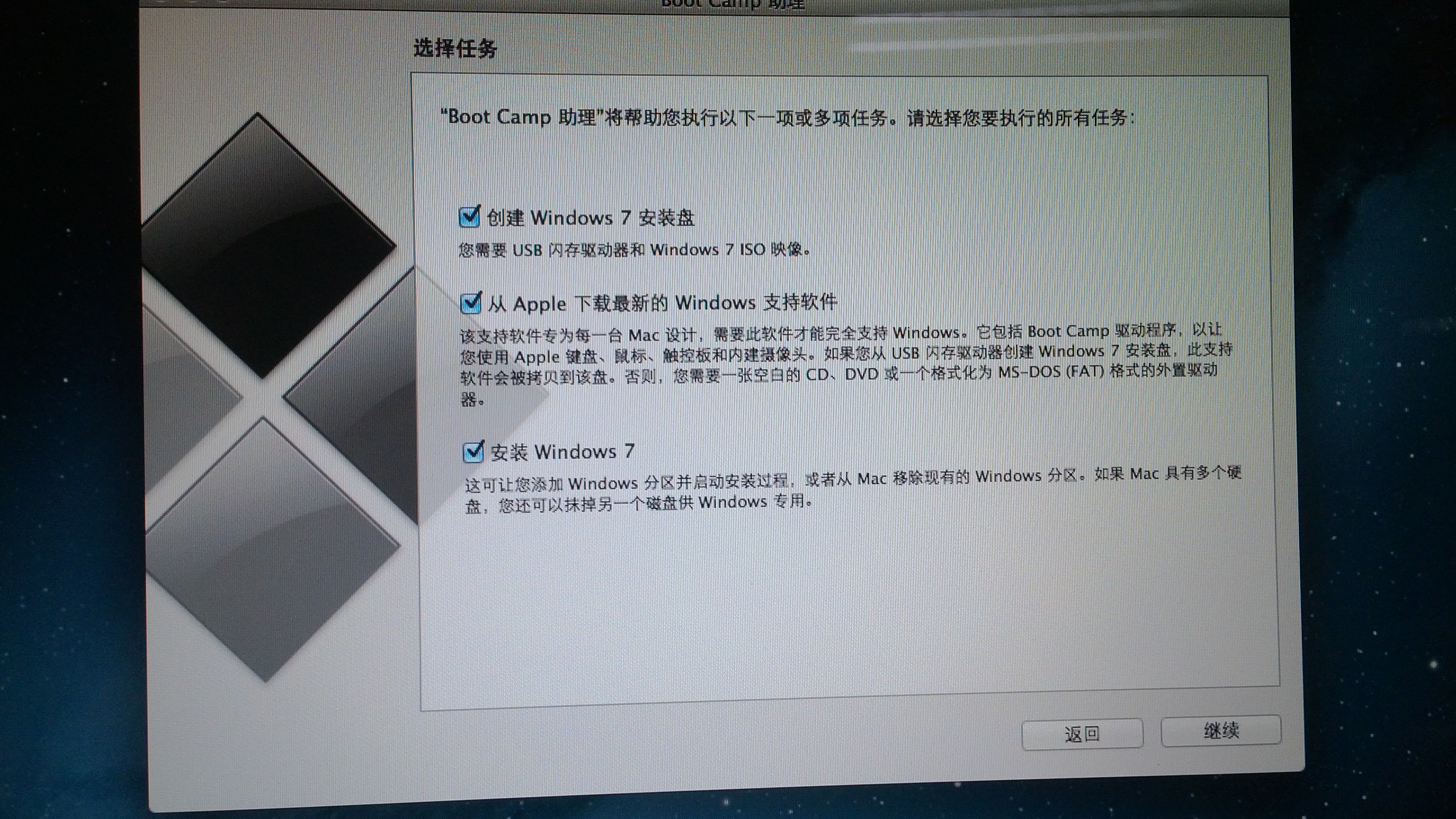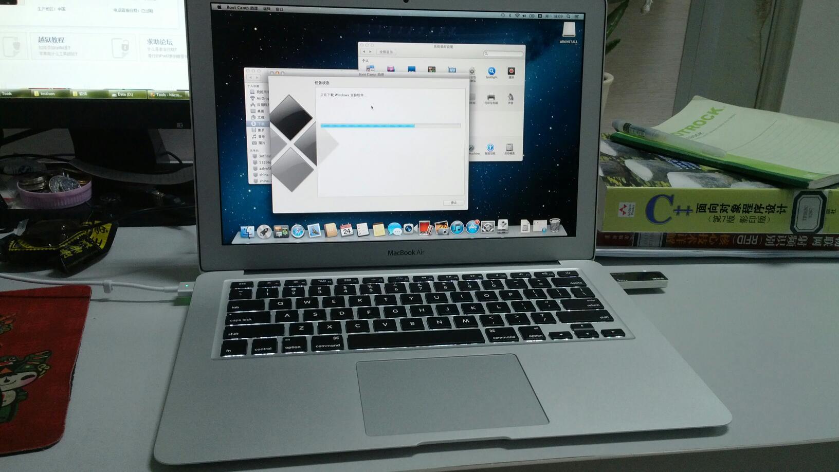安装完mac os,继续制作win 7的安装U盘(之前没找到U盘,把原来的win7安装U盘用来制作mac启动盘了,悲催),小水管就是小水管啊,苦苦等了一个多小时,那个什么windows支持软件(其实是驱动啊,bootcamp啊什么的),还是没下完。还是出去挨冻吧,抱着mac又跑到楼道,网络中断了,制作工程也就game over了,可恶的苹果,你就不会断点续传啊,什么都得从头来!重新制作,提示说什么,“无法将windows拷贝到移动设备”,这是什么问题,百思不得其解,重新找了个U盘过来,一样,悲催!万能的重启法开始起作用了,重启了下mac os,重新制作,这下好了,比较顺利。感慨下,网速快就是好啊,在实验室苦苦等了一个多小时还没下完的支持包,在寒风瑟瑟的楼道里,十几秒就搞定了……
