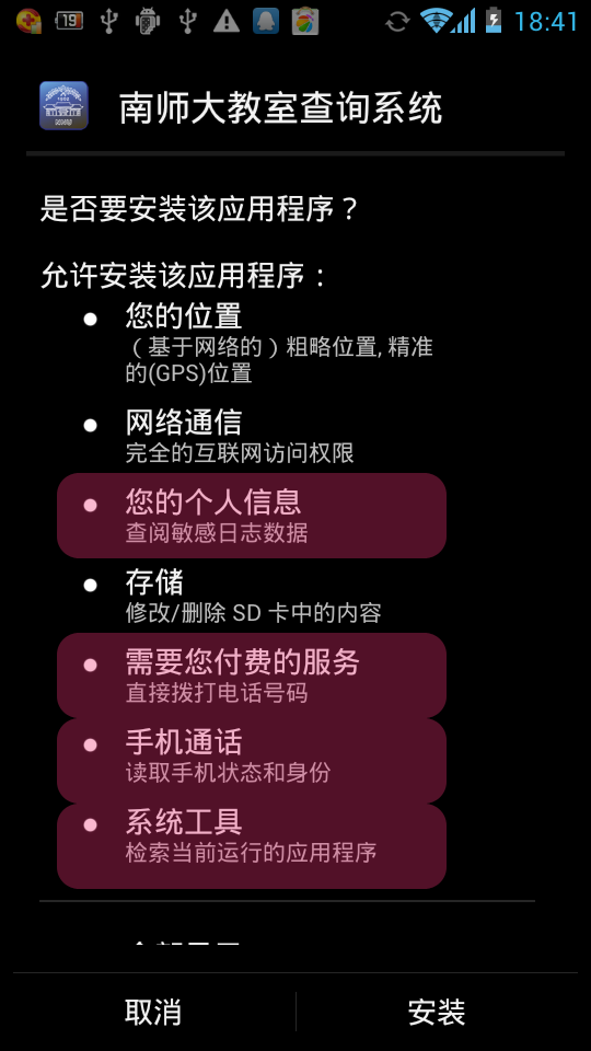 安装的时候,就对这款APP产生了厌恶感,一个简简单单的空闲教室查询系统,需要读取我的个人信息,需要直接拨打电话,需要读取手机状态和身份,需要检索当前运行的应用程序 吗?这跟流氓偷窥隐私的APP有何区别?